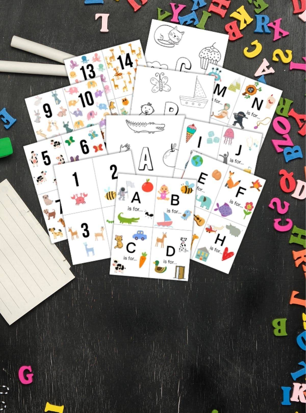 This pack includes flashcards for the alphabet and numbers 1-20, as well as coloring pages for the alphabet.