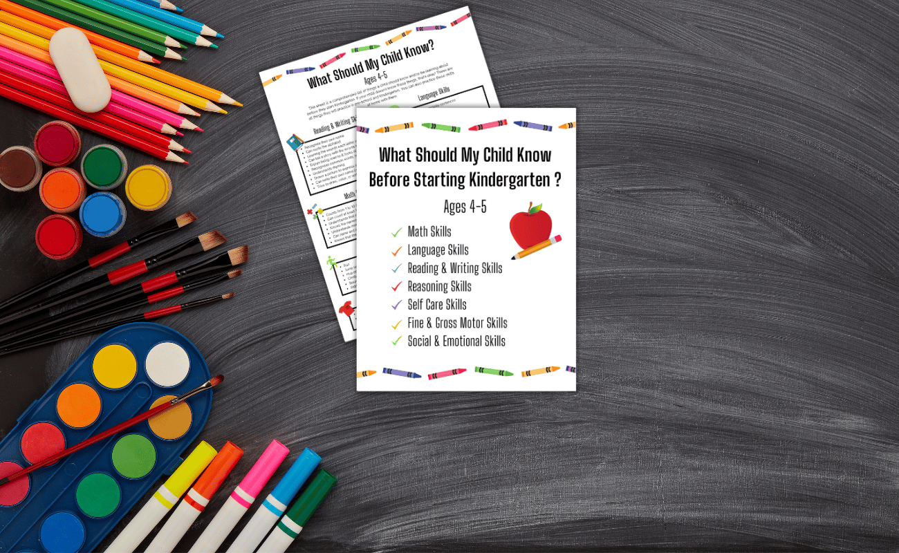 Here's a FREE checklist of everything your child should be working on before starting Kindergarten. This list is perfect for kids ages 4-5 years old!